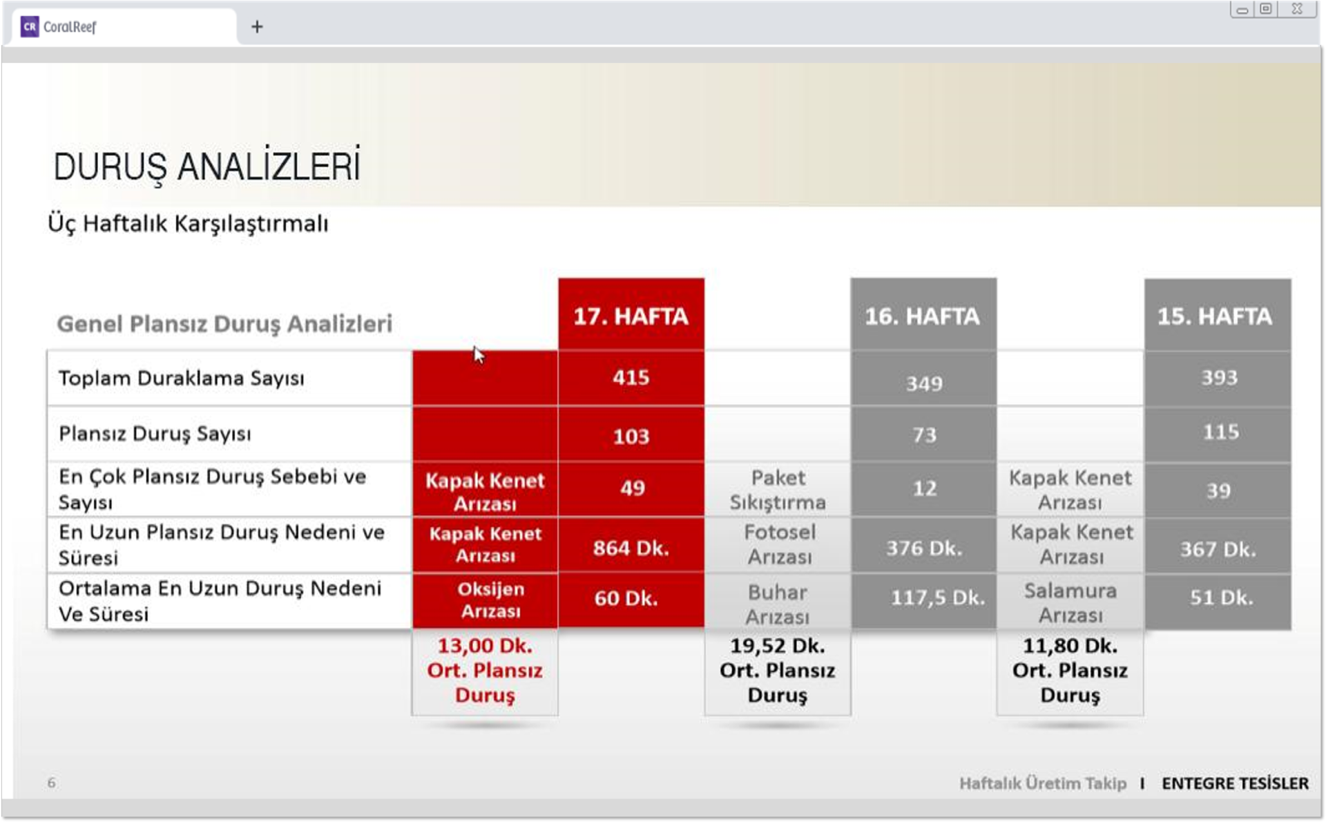 Böylece üretim performansının anlık ve detaylı olarak izlenmesi, raporlanması ve iyileştirilmesi mümkün olur. Yöneticiler, CoralReef MES'in sunduğu detaylı verimlilik analizlerine göre hızlı ve etkin kararlar alabilir.