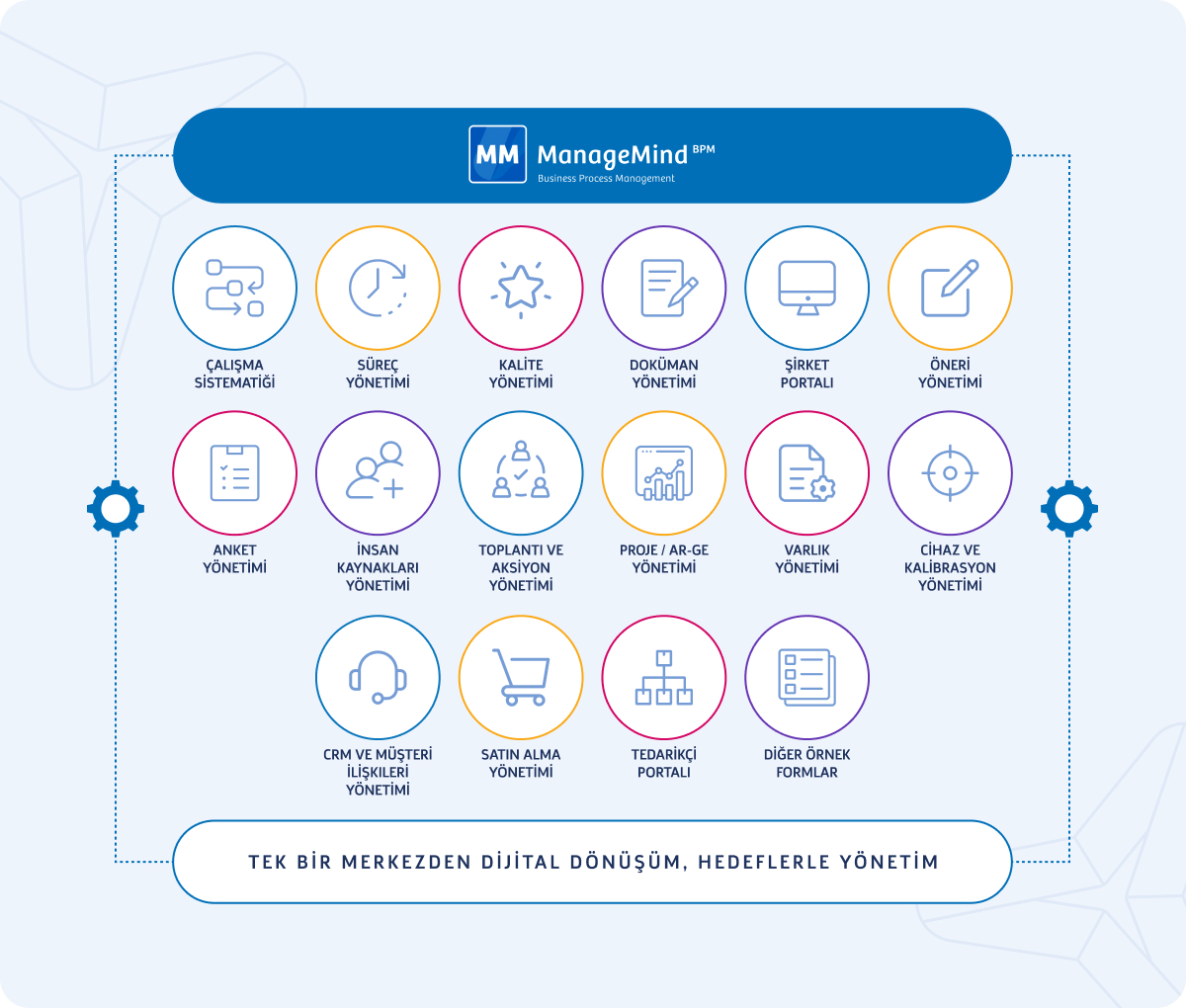 ManageMind BPM; işletmelerin örgüt kültürü oluşturabildiği ve stratejik kararların yönetilebildiği, süreç haritasının çizilerek süreç takibinin yapılabildiği, kalite dokümantasyonunu yapabildiği ve yönetebildiği ve anahtar performans göstergelerinin (KPI) izlenebildiği, en önemlisi de şirkette bulunan tüm formların kullanıcılar tarafından tasarlanıp, raporlanabildiği bir “Strateji ve Kalite Yönetim Sistemi”dir.