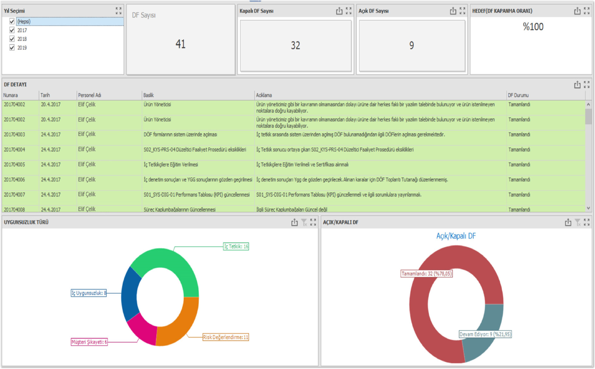 ISO 9001 sisteminin isterleri olan İç tetkik, DF, Doküman ve revizyon takibi işlemlerini yönetebilirsiniz.